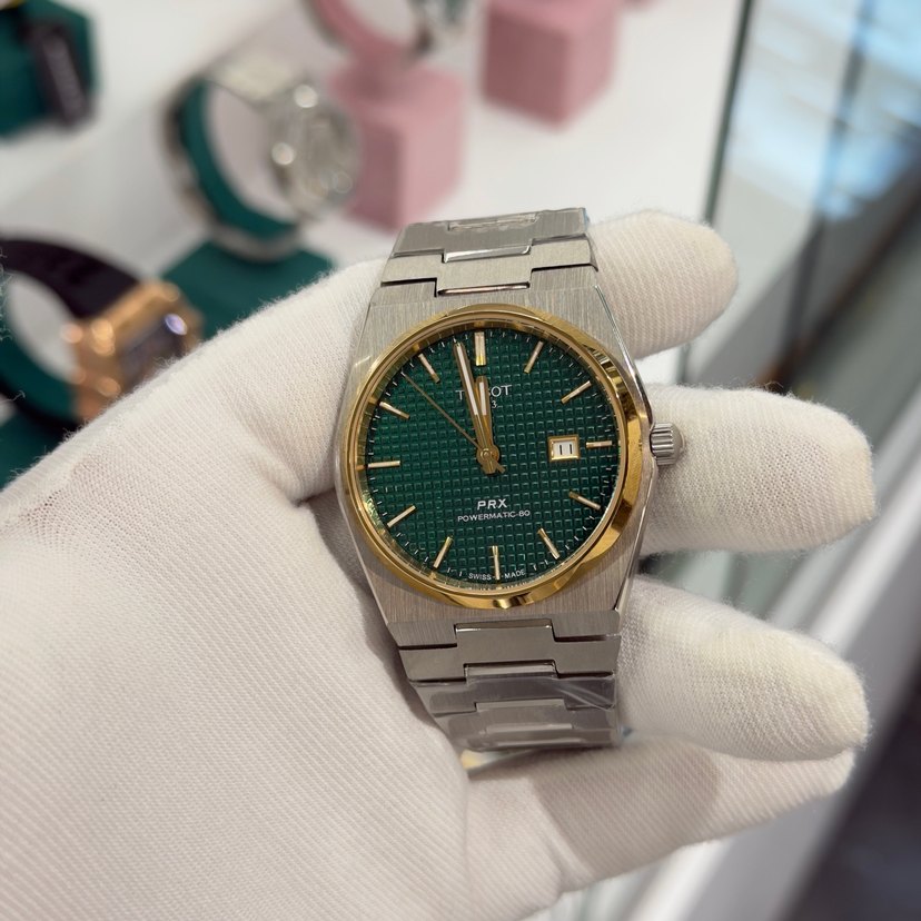 Tissot PRX erkek saati, yeşil dokulu kadran ve altın tonlu detaylara sahip. Gri paslanmaz çelik kasa ve bilezik ile klasik ve çağdaş tarzı bir araya getirir. ⌚