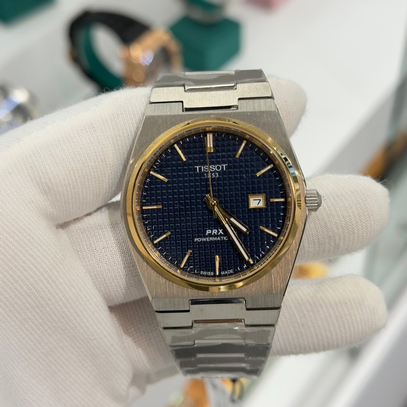 Tissot PRX Powermatic erkek saatte parlak altın bezel, dokulu mavi kadran ve tarih göstergesi bulunur. Paslanmaz çelik bilezik ve modern klasik tasarım içerir. ⌚