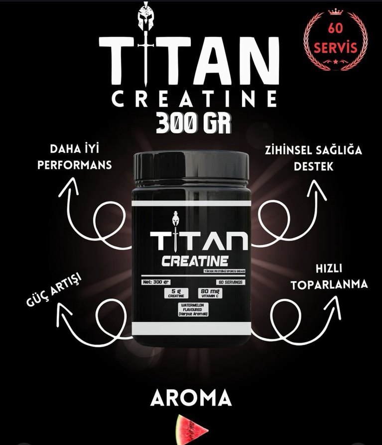Titan Kreatin 300GR, 60 servis içerir. Zihinsel sağlık desteği, daha iyi performans, hızlı toparlanma ve güç artışı sağlar. Karpuz aromalı.