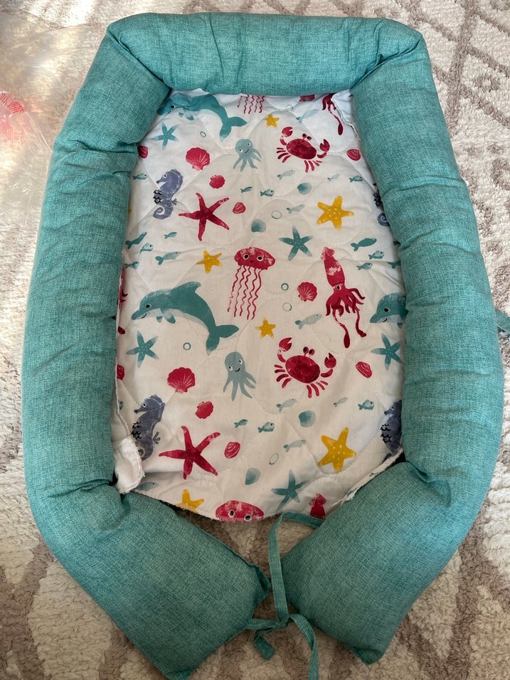 Turkuaz yastıklı kenar ve renkli deniz canlıları desenli yumuşak kumaş iç yüzeye sahip bebek yatağı. Titreşimlidir çalışıyor bebek arabada gibi hissediyor ve masaj yapıyor uyumasını kolaylaştırıyor.