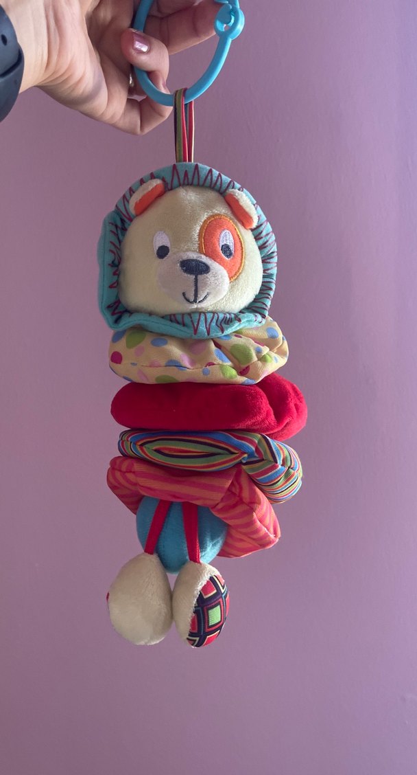 Yumuşak kumaş ve çeşitli dokulara sahip renkli ayıcık şeklinde diş kaşıyıcı ve çıngırak. Tutması ve asması kolay.