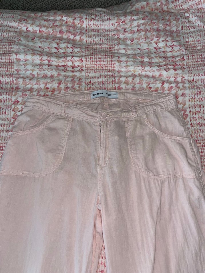 Uygun çamaşırla arka cepleri sayesinde iç göstermez, pembe renkte, nakış detaylı, düğmeli,keten kumaştan bol kesim bohem tarzı kadın pantolon.