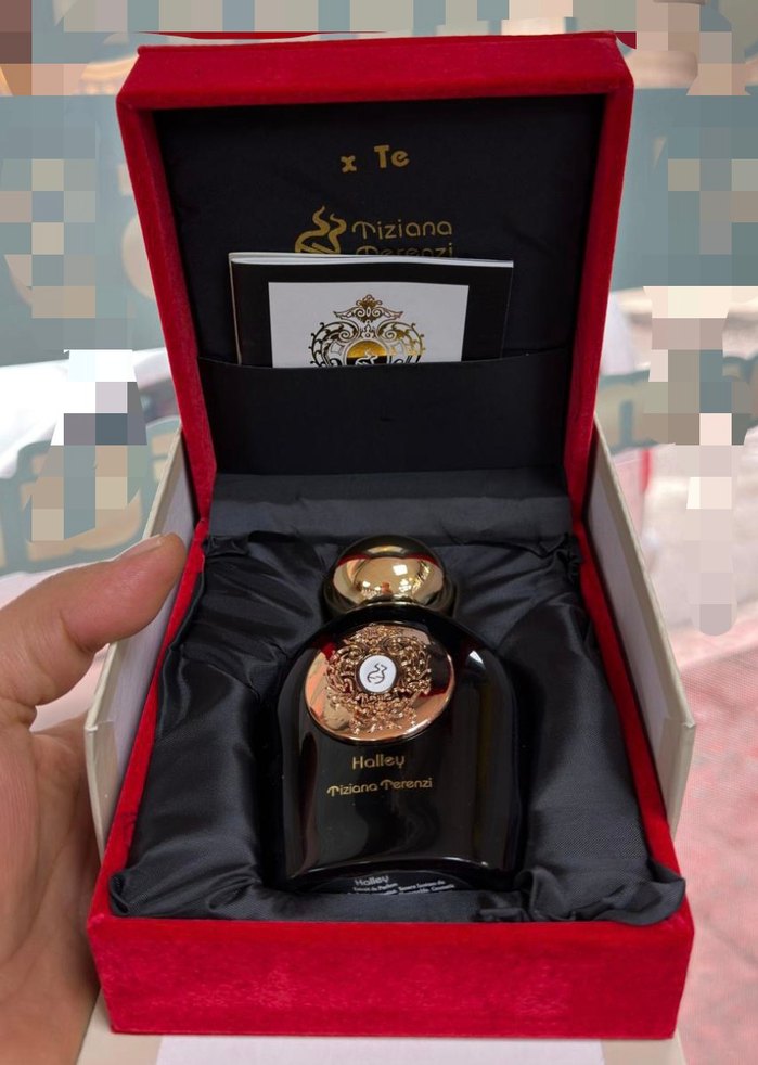 Kırmızı kadife kutuda, siyah ve altın detaylı Tiziana Terenzi Holley kadın parfümü. Kutuda bir kitapçık da yer alıyor.