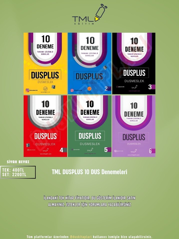 "TML DUSPLUS 10 Deneme Kitapları Seti" ilanıdır. Siyah-beyaz spiralli şekilde tüm Türkiye'ye ücretsiz kargolanır. Tüm fiyatlar ilan görselinde belirtilmiştir. İlandaki tek kitap fiyatıdır, belirtilen haricinde indirim yoktur. #dus #duskitaplari #dusdata #tusdata #kitap #ders #calisma #sorukitabi #soru #dusdatamax #datamax #dusakademi #konu #konukitabi #hizlitekrar #tml #dusmeslek #bransdenemesi #brans #renkli #siyahbeyaz #denttest #ucuz #1+2 #tts #tumdus