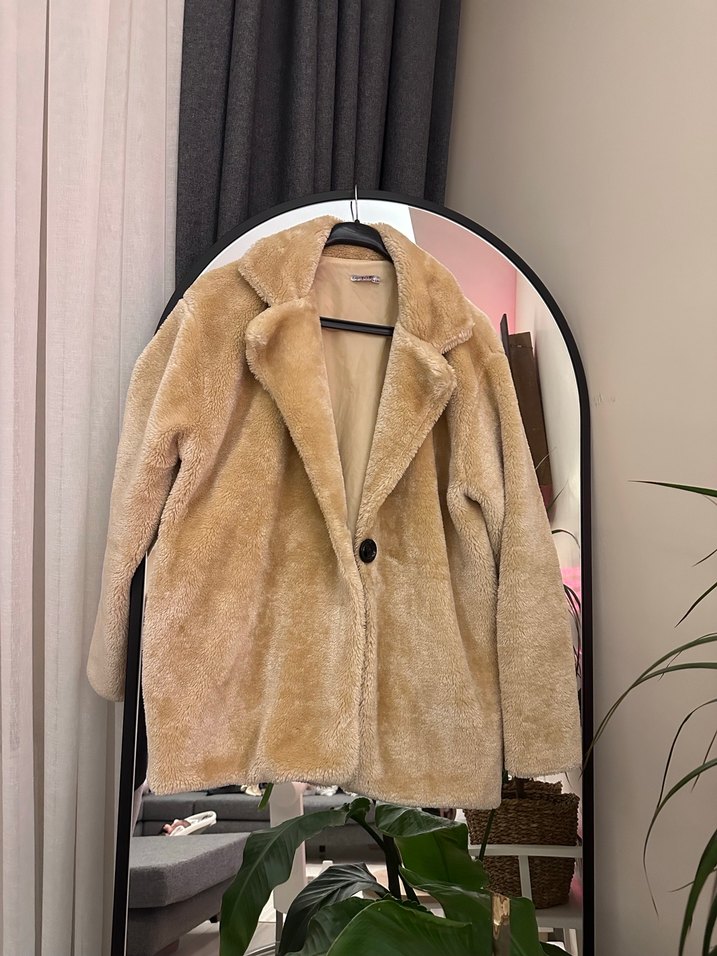 Tobi markalı, bej renkli peluş (teddy) kaban satılıktır. Yumuşak dokulu, sıcak tutan ve günlük kombinlere çok yakışan bir modeldir. Tek düğmeli, rahat kesimlidir. • Beden: L / XL • Boy: 78 cm • Renk: Bej • Marka: Tobi • Temiz, sorunsuz çok az kullanıldı iyi durumda.