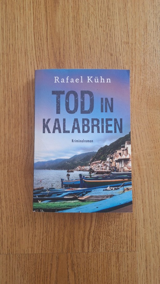 Rafael Kühn'ün Kalabrien'de geçen suç romanı 'Tod in Kalabrien'. Kapakta sahil, tekneler ve binalar yer alıyor. 2024 basım