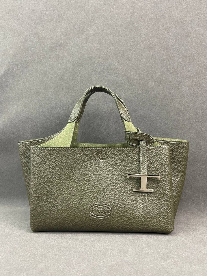 Yeşil deri kadın el çantası, tokalı detaylı, minimalist ve çağdaş tasarımlı, gri tonlarında. Günlük kullanım için klasik zarafet sunar. Tod’s 7 Renk Seçeneği Deri Tozlu Vıp Kalite 3 Bölmeli Renge Renk Boyalar Ayarlanabilir Uzun Askı Seçeneği 30 X 20 cm L