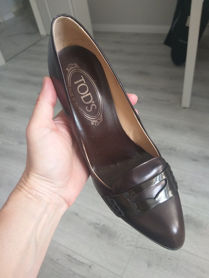 TOD'S marka kahverengi deri klasik ayakkabı, blok topuklu ve parlak tokalı, ofis kullanımına uygun Sadece bir kere birkaç saat kullanılmış Tod's marka 36,5 numara tertemiz ayakkabı.