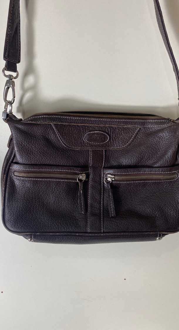 Kahverengi deri, minimal biker tarzında, çoklu fermuarlı bölmeleri olan kadın çantası, günlük kullanım için uygundur.