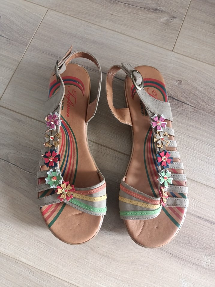 Bohem tarzda, dolgu topuklu ve tokalı kadın sandaleti. Pastel çok renkli çiçek desenli, kauçuk malzemeden, günlük kullanım için uygun. 38 numaradır. *Hiç kullanılmamış* olup bekleme kaynaklı fotoğraflarda görünen yerlerde tabanda bir kaç ezilme izi ve sağ tekin arka kısmında küçük ve belirsiz bir soyulma olmuştur.
