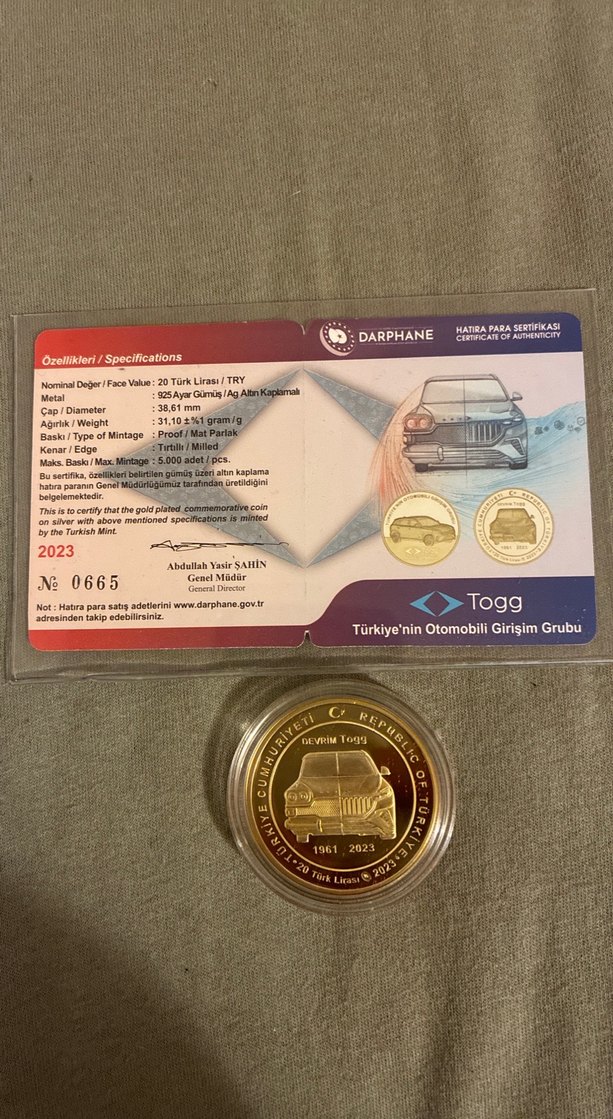 2023 tarihli, Türkiye'nin Otomobili Girişim Grubu Togg'u anan parlak gümüş üzeri altın kaplama hatıra parası ve sertifikası ile birlikte.