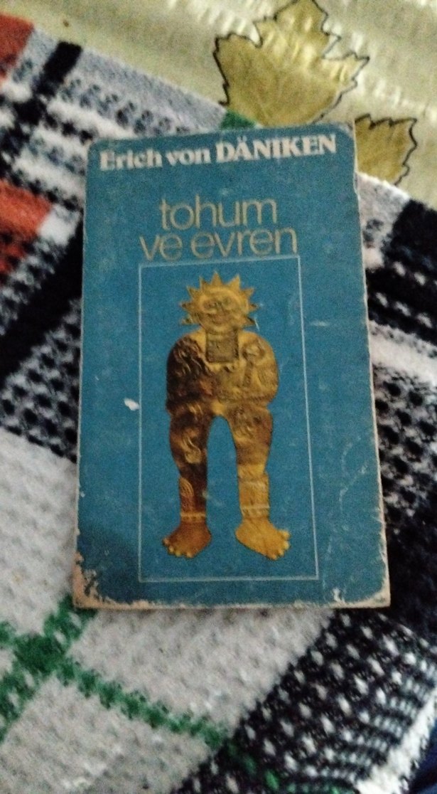 Erich von Däniken'in "Tohum ve Evren" kitabı mitoloji ve eski gizemleri konu alır. Kapakta sembolik bir figür yer alır.