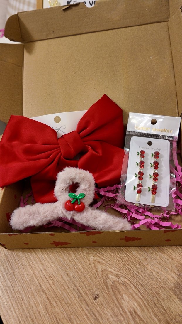 Büyük kırmızı fiyonk toka, kiraz detaylı ikili toka ve nakışlı kiraz desenli pembe toka içeriğinden oluşur.
