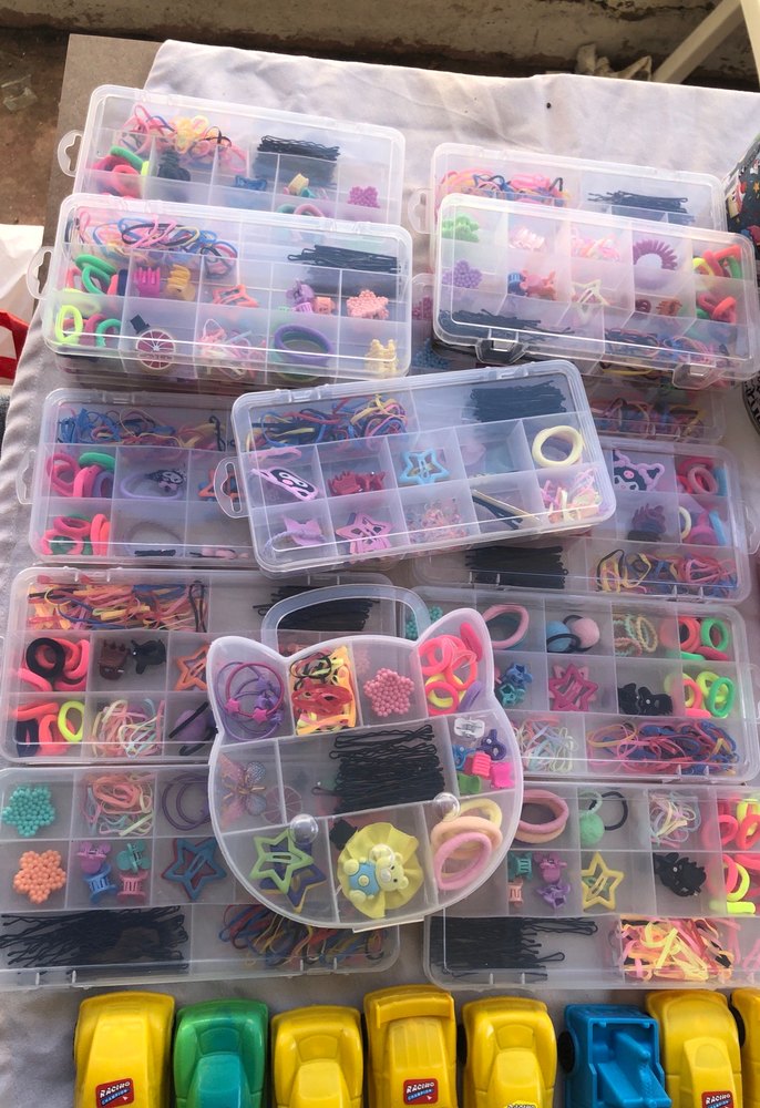 Çocuklar için çeşitli şekillerde ve desenlerde renkli elastik saç bantları ve tokalar seti, düzenli bölmelerde yer alır. Adet 150 TL