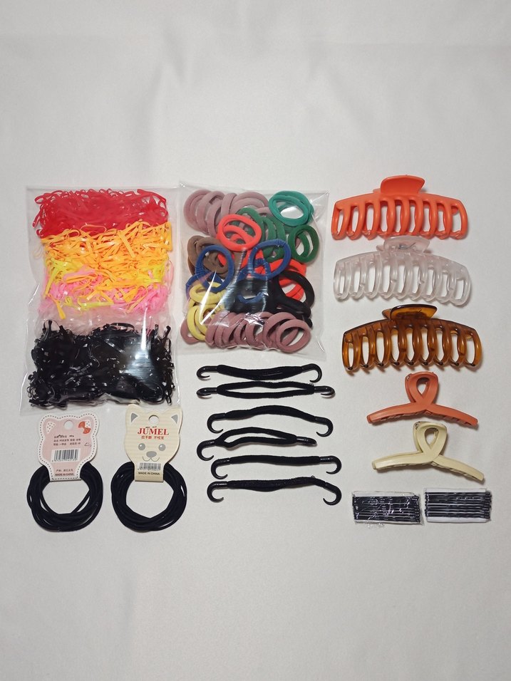 Çocuklar için çok renkli elastik saç bantları ve tokalar seti, farklı stiller içerir. Trendy ve avangart görünümler için uygundur.