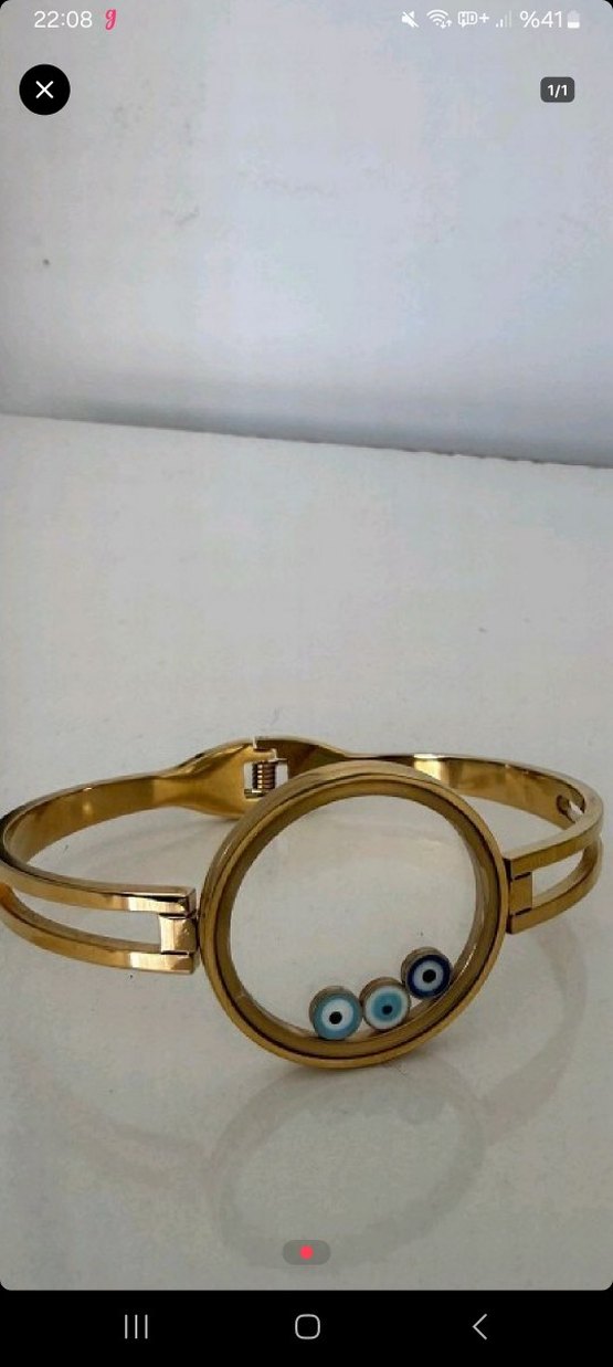 Parlak altın renkli, tokalı kadın bilekliği. Minimalist ve çağdaş tarzda, dairesel çerçeve içinde üç küçük nazar boncuğu motifi bulunur. Günlük kullanıma uygundur. ✨