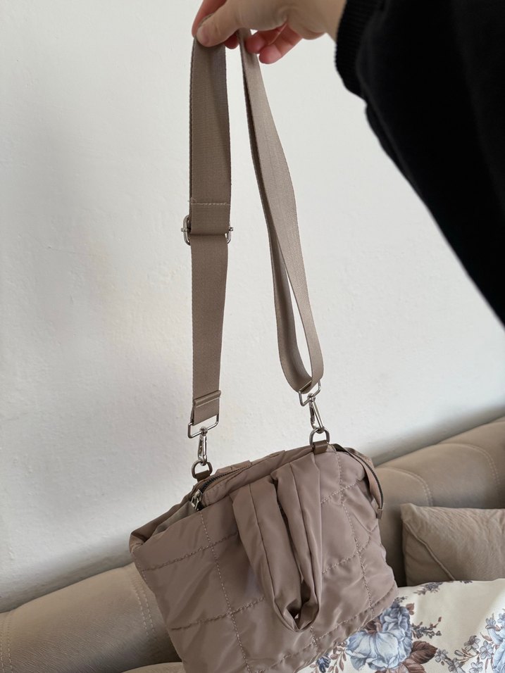 Bej ve gri tonlarında, tokalı ayarlanabilir askılı, yumuşak sentetik kumaştan yapılmış çağdaş kadın omuz çantasıdır, günlük kullanıma uygundur. #çanta #kadın #spor