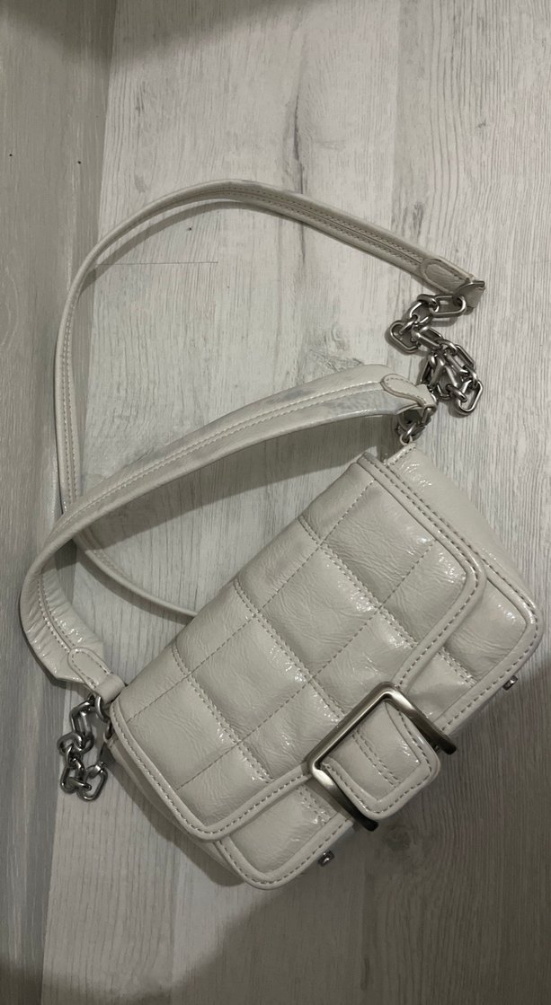 Tokalı kapak ve zincir detaylı askısı olan beyaz deri kadın çantası, şık ve gündelik kullanıma uygun. Anlamadığım bir leke oluştu ama gözle görülür bir şey yok