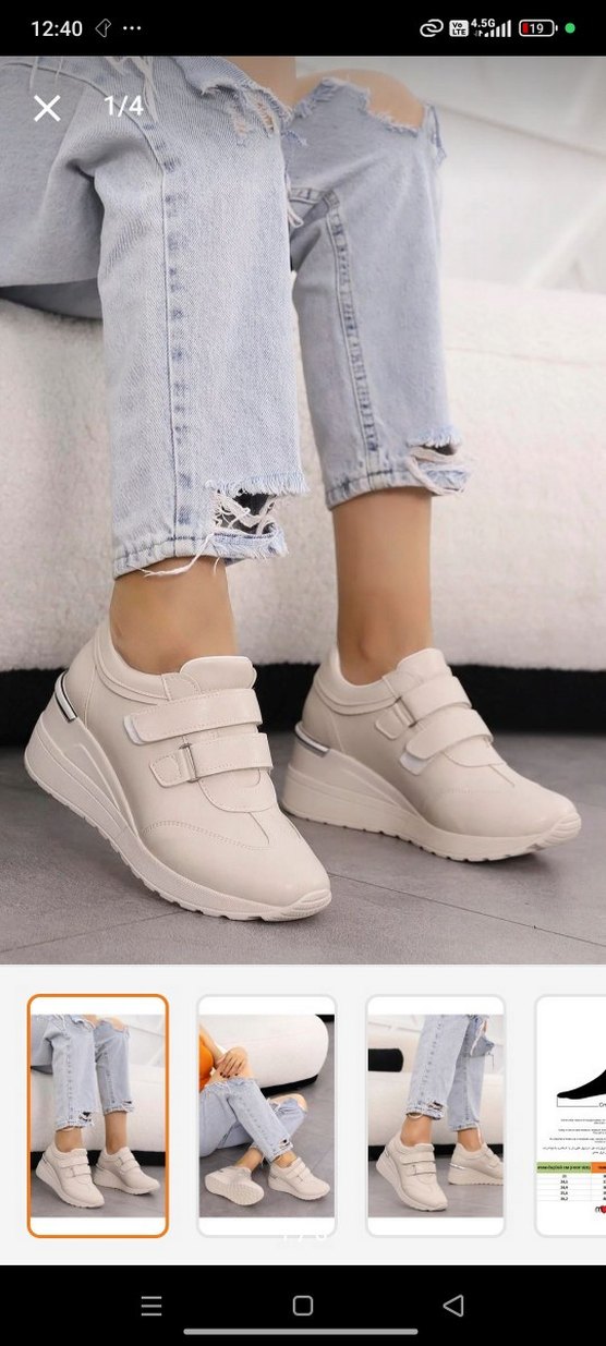 Beyaz, tokalı ve dolgu topuklu kadın spor ayakkabısı. Rahat ve hafif kauçuk tabanlı, günlük sokak stili için uygun. ️7 cm topuk boyu iki kere kullanildi