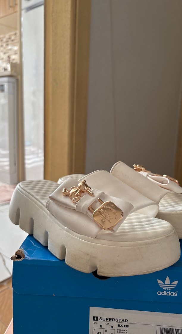 Beyaz, tokalı platform kadın terlik. Kauçuk tabanlı, sokak stiline uygun, minimalist ve günlük kullanıma uygun şık tasarım.