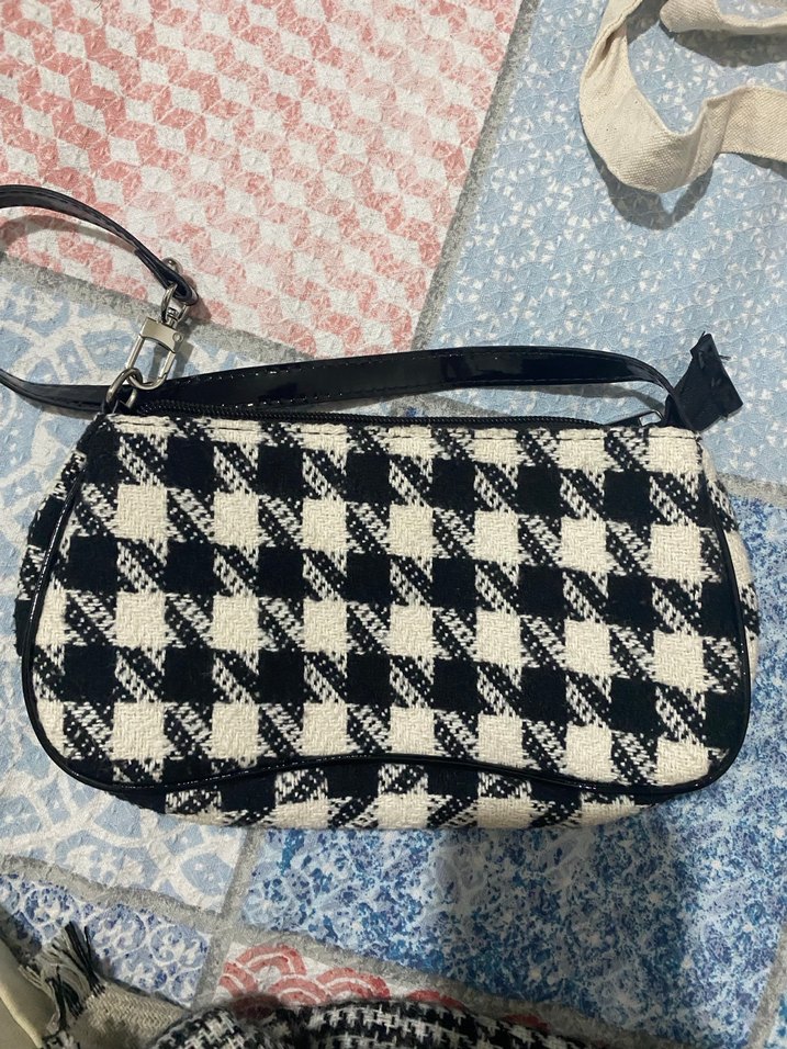 Kadın çantası, tokalı ve siyah beyaz ekose desene sahip, sentetik kumaştan yapılmıştır. Günlük kullanıma uygun bohem ve retro tarzda.