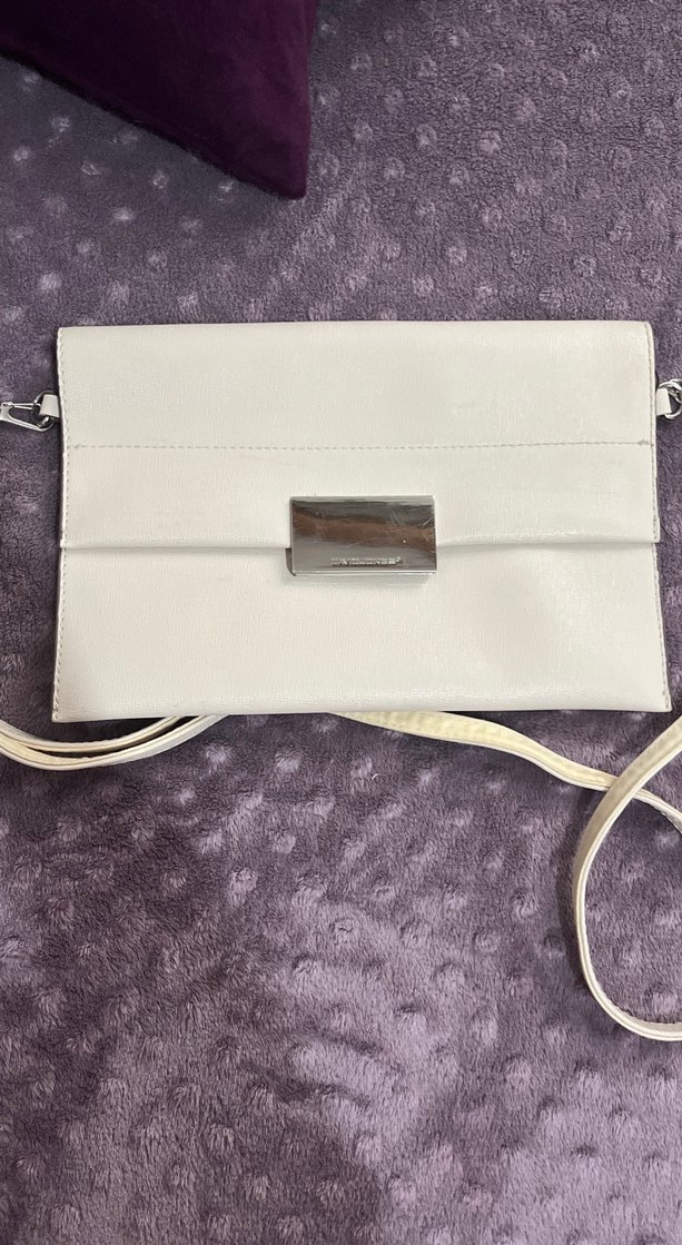 Tokalı beyaz süet kadın çanta, ince askılı ve minimalist tasarıma sahip, günlük kullanıma uygun sade ve modern bir görünüme sahiptir. Arkasında biraz leke var.