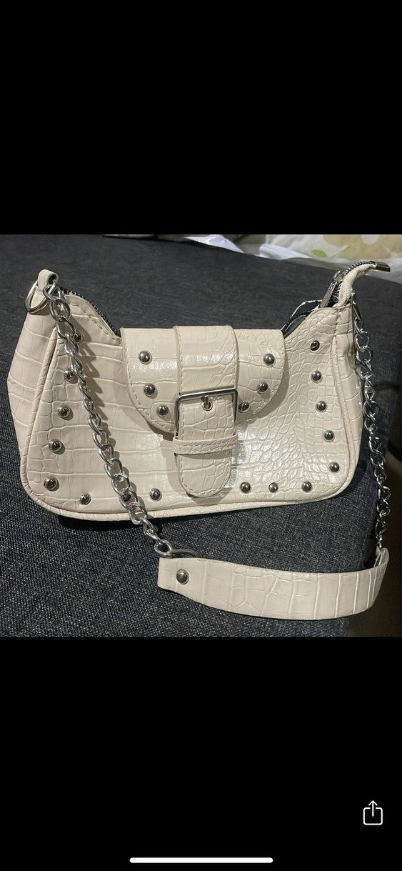 Tokalı kapaklı, metal aksesuar detaylı beyaz yılan derisi desenli deri çanta. Zincir askısı ve deri omuz pediyle trend sokak stilini yansıtıyor.