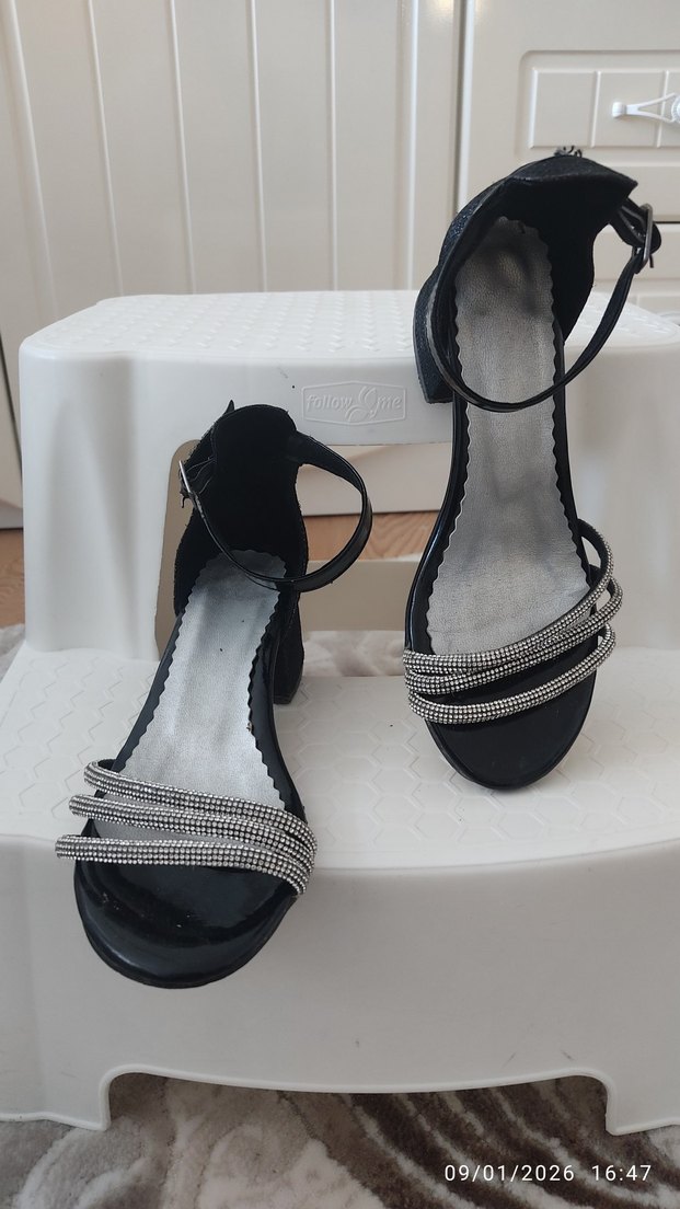 Tokalı bilek kayışı ve taş detaylı şık siyah yılan desenli çocuk blok topuklu ayakkabı. Rahat kauçuk tabanlı, günlük kullanıma uygun.