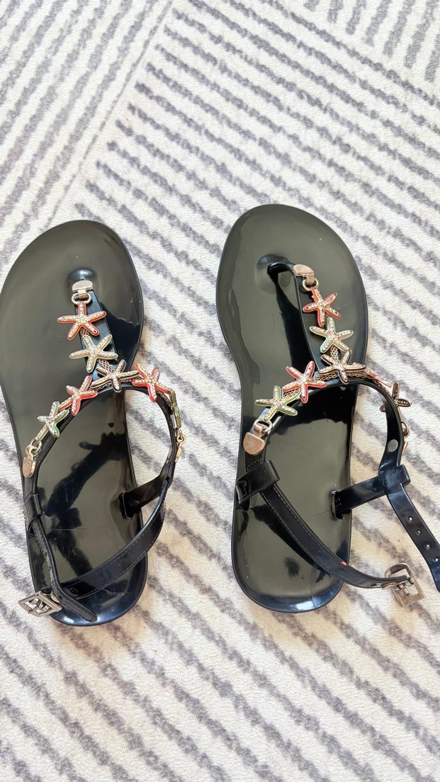 Tokalı kaymaz tabanlı kadın sandaletler, çok renkli denizyıldızı detaylarıyla plaj için uygundur. Bohem ve retro tarzda rahat kullanım sağlar. marka temsili