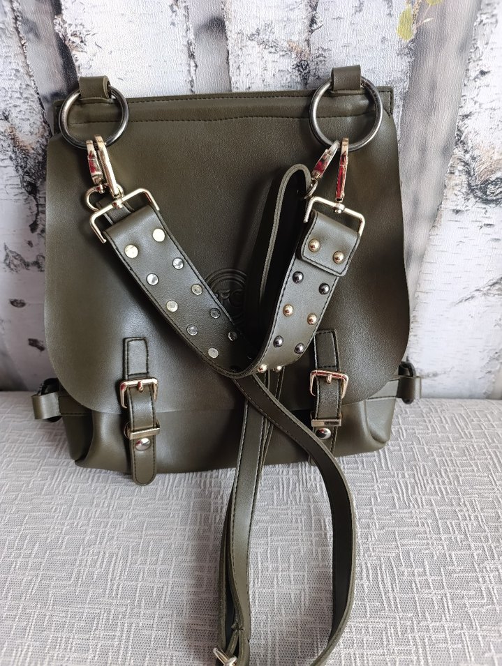 Tokalı kayışları ve haki deri tasarımıyla kadın biker çantası, günlük kullanıma uygundur.
