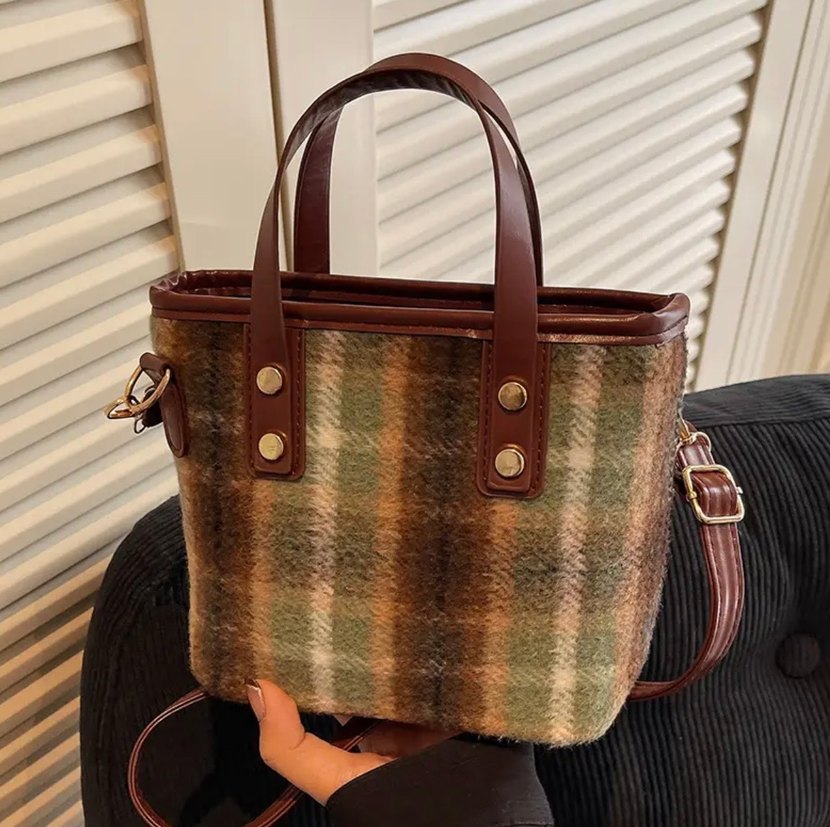 Bu kahverengi yün çanta, ekose deseni ve tokalı detaylarıyla vintage tarzı ve sıcak dokuyu bir araya getiriyor. Günlük kullanım için sağlam kulplu ve rahat şekildedir.
