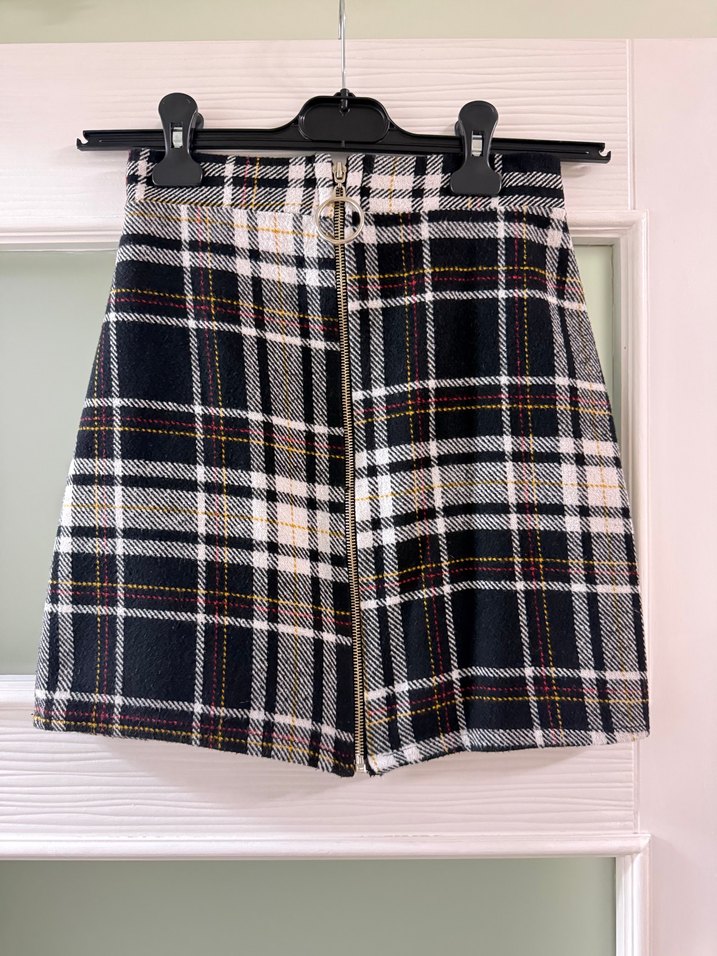 Tokalı detayı ve ekose deseniyle, rahat kesimli koyu renkli çok renkli mini etek, günlük sokak stiline uygundur.