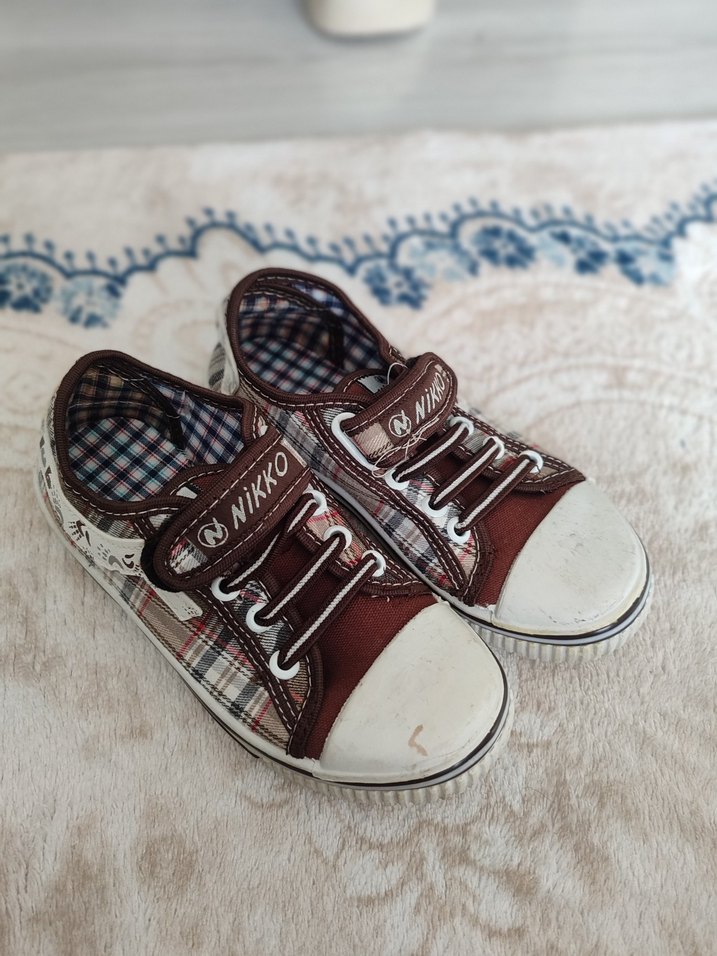 Tokalı tasarıma sahip kahverengi erkek çocuk sneakers, bağcıklı ve bağlamalı desenli, kauçuk tabanlı sokak stili ayakkabı.