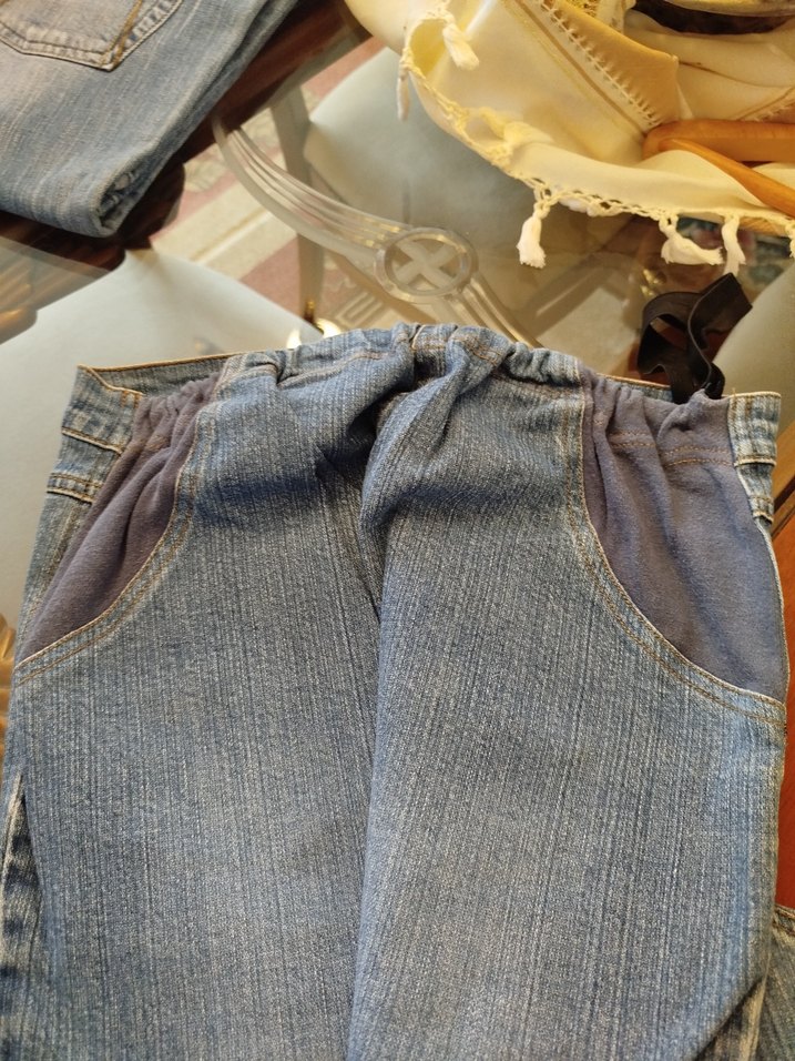 Tokalı detaylı, geniş kesim hamile kot pantolon, rahat elastik bel bandıyla günlük kullanıma uygun.