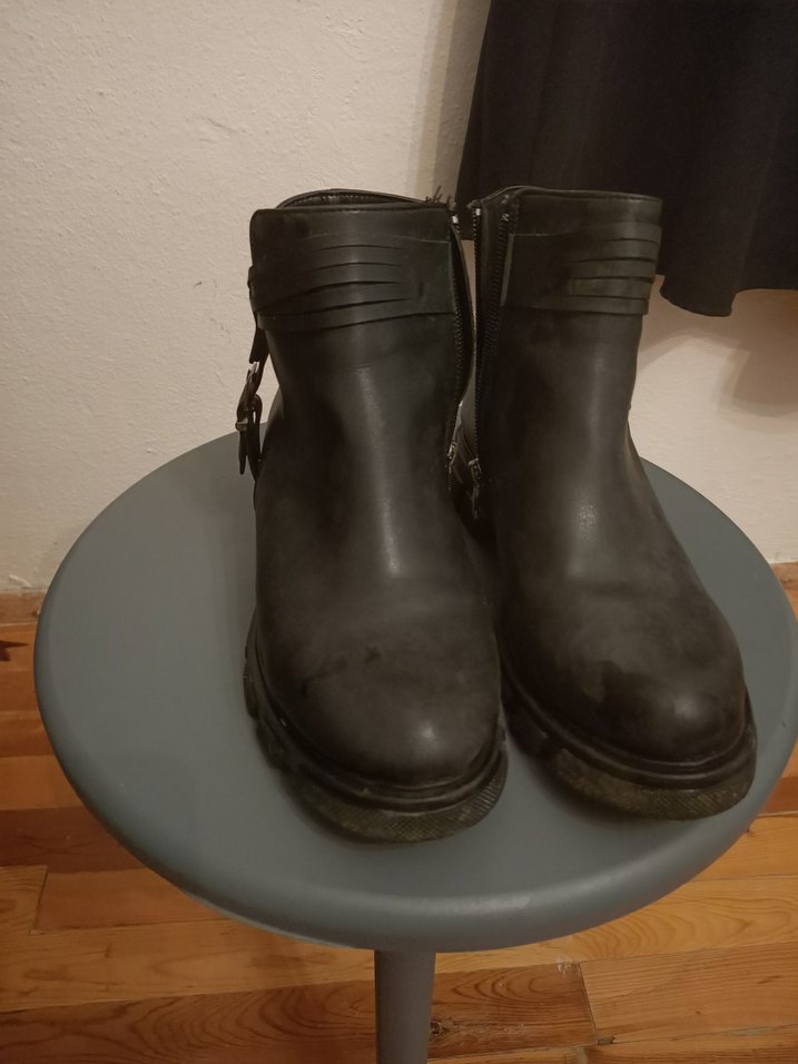 Tokalı detaylara sahip gri deri biker stili yüksek topuklu kadın botu, günlük kullanıma uygun grunge punk tarzında. diğer marka