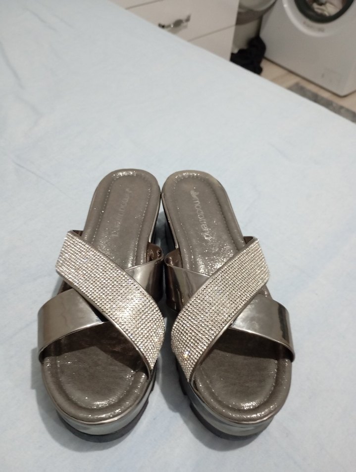 Gri renk, metalik görünümlü, tokalı dolgu topuk kadın terlik. Günlük kullanıma uygun, çağdaş tasarım. ✨