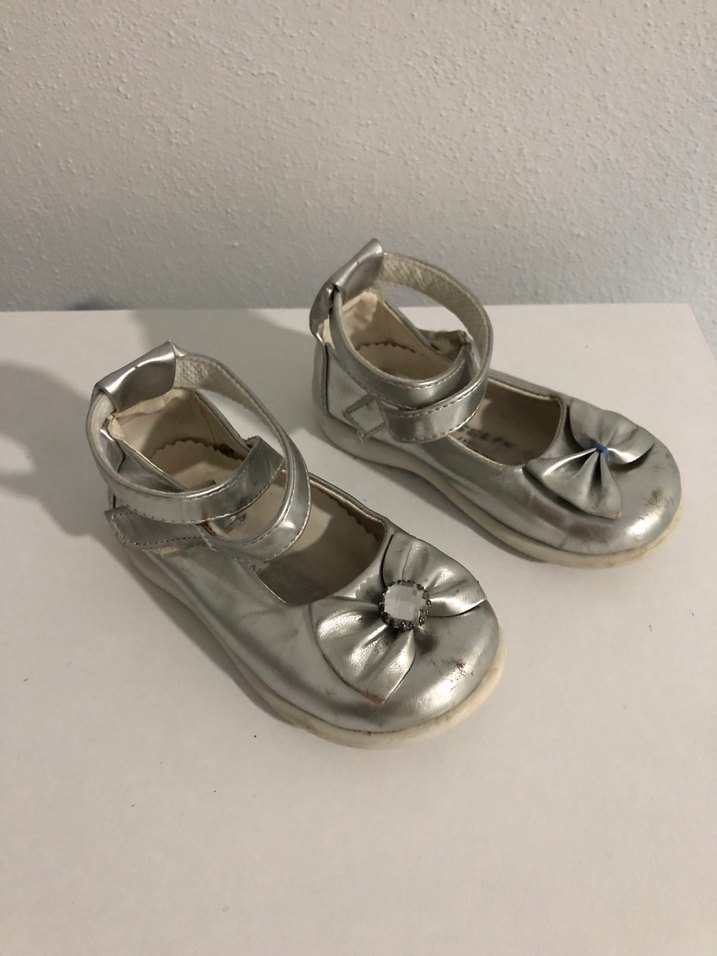 Tokalı kayış ve küçük fiyonk detaylı, metal aksanlı gri kız çocuk babet ayakkabısı.