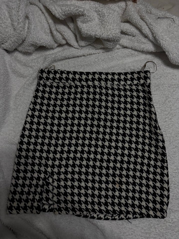 Tokalı detaylı, gri ekose desenli, sentetik kumaştan yapılmış, dar kesim mini etek, günlük sokak stili için uygundur.
