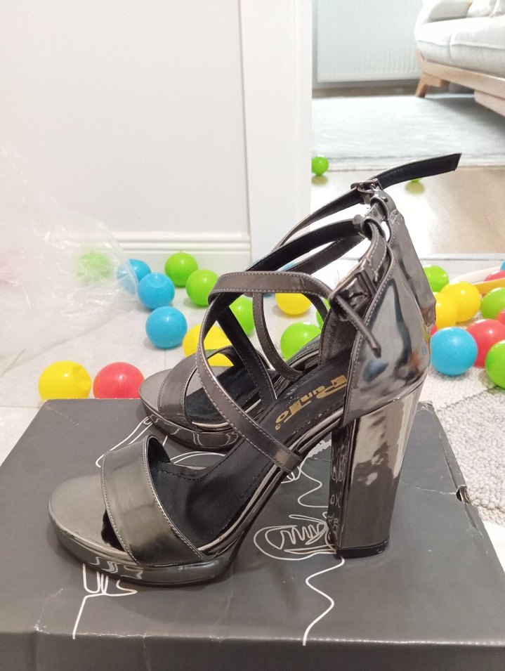 Kadın abiye ayakkabılar, tokalı detaylı, gri çok renkli desenli ve platform topuklu. Dayanıklı kauçuk malzemeden yapılmıştır, parti için uygundur.