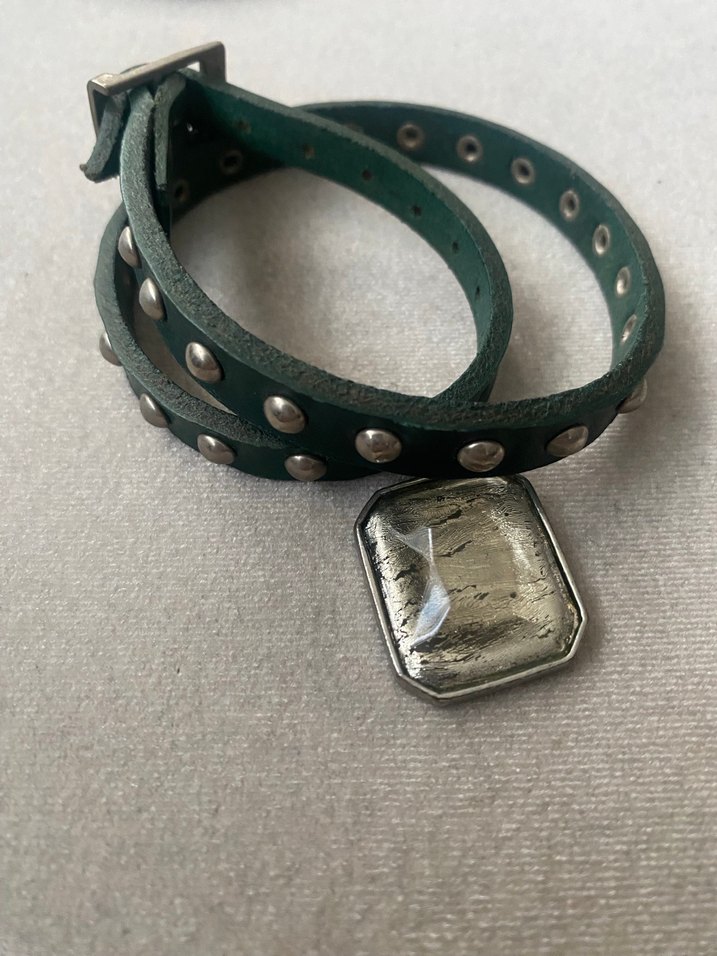 Tokalı, haki renkte kadın bileklik. Rock punk havası taşıyan, günlük kullanıma uygun tasarım.