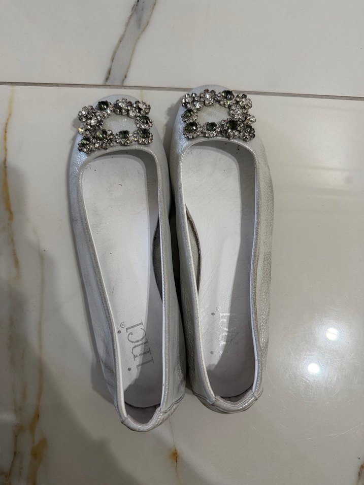 Beyaz rubber malzemeden yapılmış, tokalı ve dolgu topuklu kadın babetler. Minimalist ve çağdaş tarzda, düğün için uygun, desensiz tasarım.Düğünümde giydim sadece.