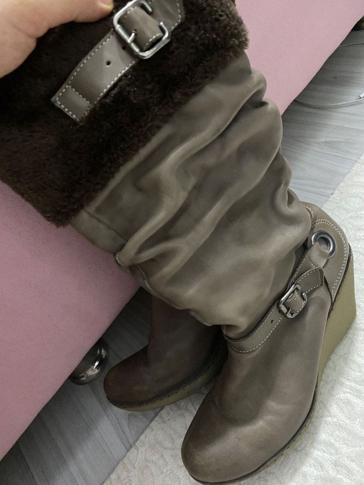 Kahverengi-gri süet diz boyu botlar, tokalı detaylar ve dolgu topuklu, rahat sokak stili için uygundur.