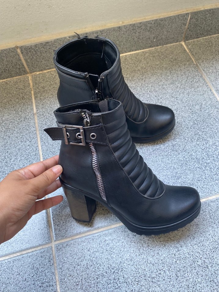 Siyah kauçuk kadın botları, kalın topuklu ve tokalı detaylıdır. Fermuar ve kapitone dikişli tasarımı ile şık ve rahat bir görünüme sahiptir.