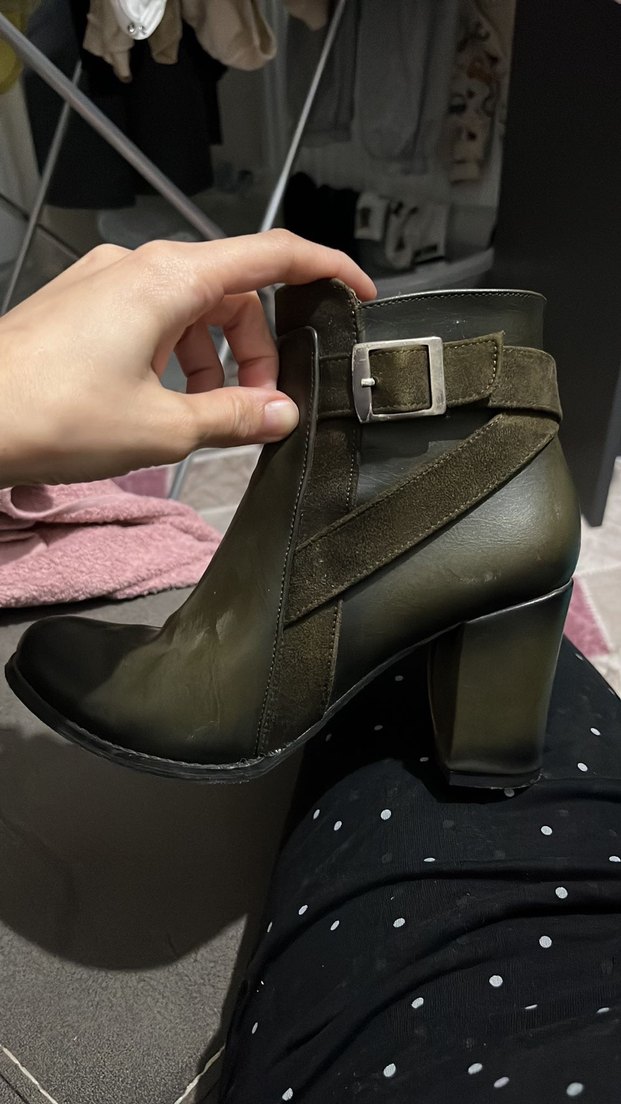 Tokalı kayış detaylı, kahverengi deri kadın botu. Düzensiz desen içermeyen, blok topuklu rahat tasarım.