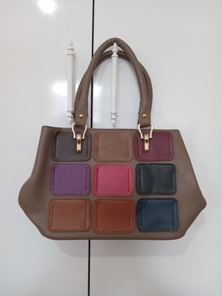 Tokalı detaylara ve renkli kare parçalara sahip kahverengi deri çanta, günlük kullanıma uygun modern tarzda, trendi casual stil için ideal.