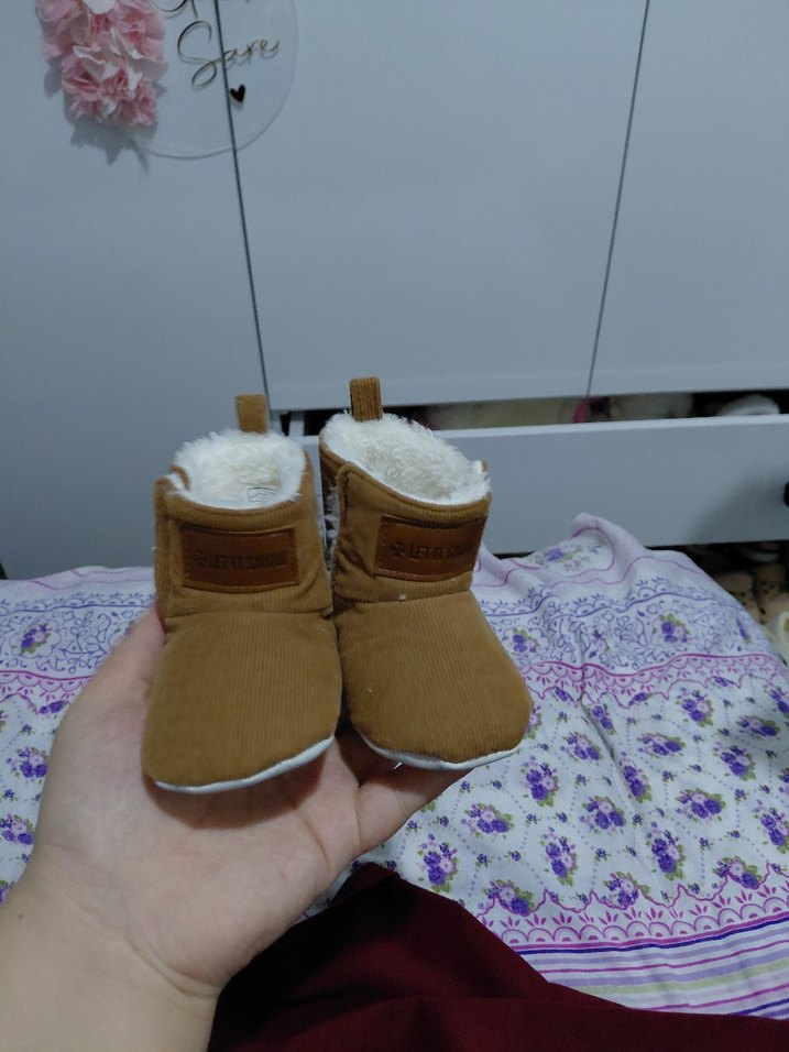 Tokalı, yumuşak kahverengi erkek bebek ev botu, içi sıcak ve rahat tutan yumuşak astarlı. Küçük ayaklar için ideal.