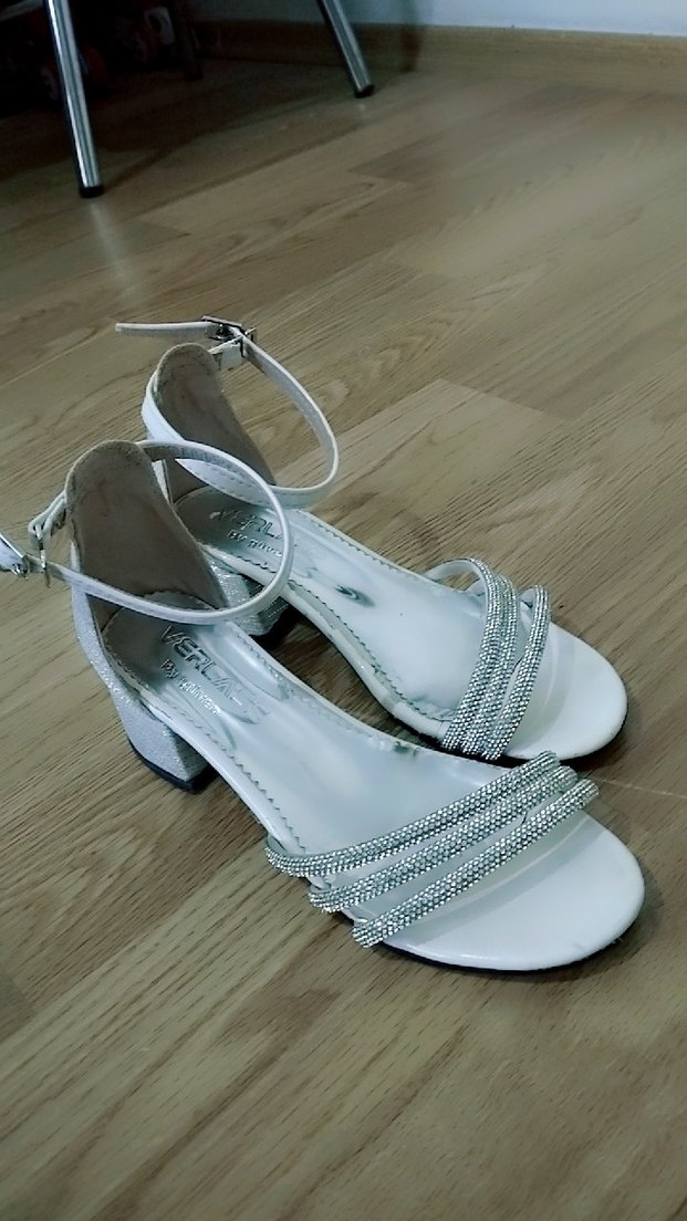 Düğünler için uygun, parlak ve tokalı bilek kayışlı beyaz blok topuklu kız çocuk abiye ayakkabı. Bir kez düğünde giyildi temiz kullanıldı 34 numara