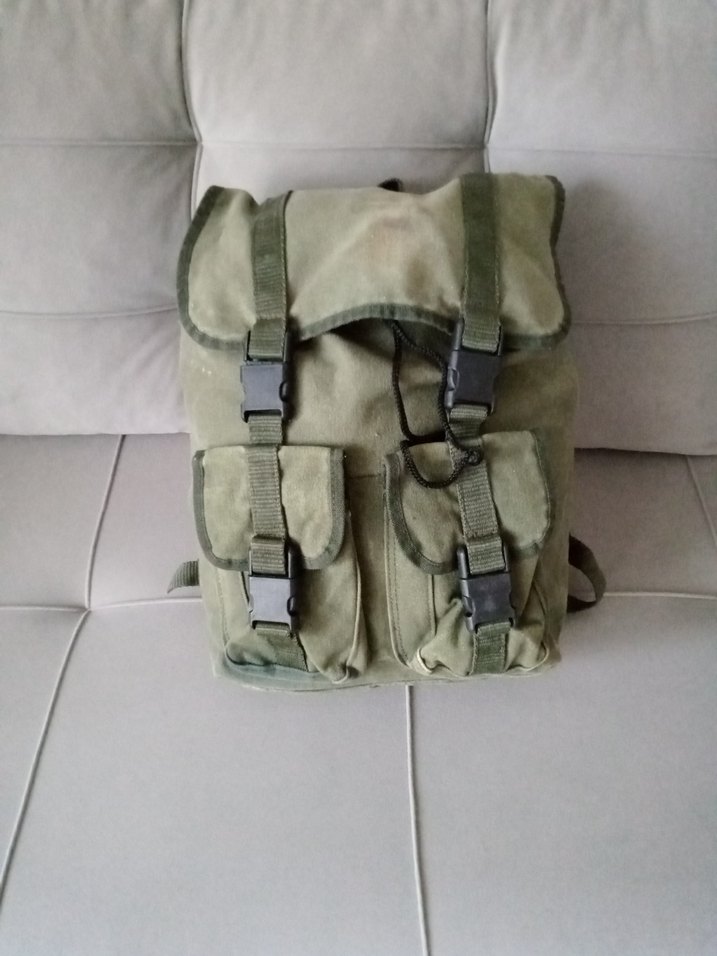 Kamuflaj desenli, tokalı ve ön cepli khaki erkek sırt çantası, sade ve işlevsel tasarıma sahiptir.