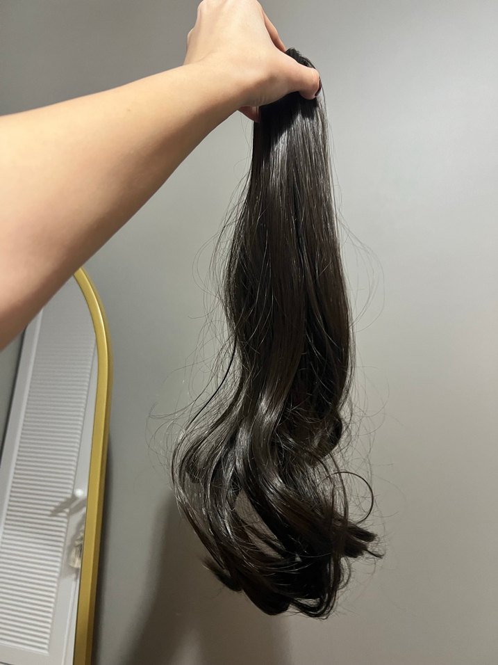 50.8 cm hiç kullanılmadı sentetik fakat gerçek saç gibi duruyor flaşlı çektiğim için daha parlak kuaförde yaptırmıştım kaynak taktırmak istemediğim dönemde