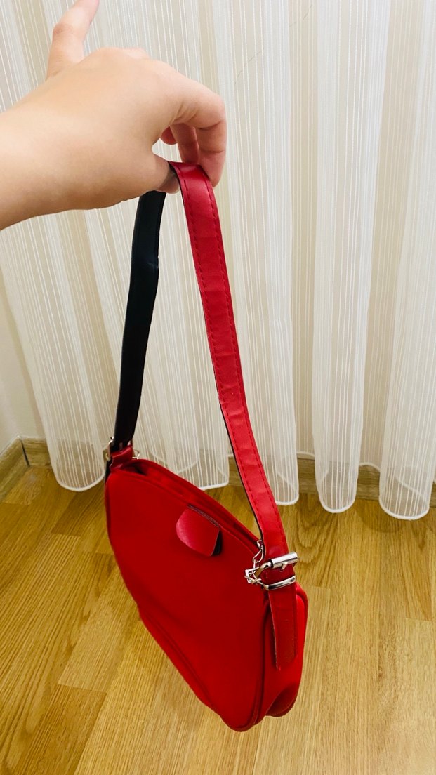 Sentetik kumaştan yapılmış, tokalı kırmızı kadın omuz çantası. Desensiz tasarımı sokak stili için uygun ve günlük kullanıma uygundur.